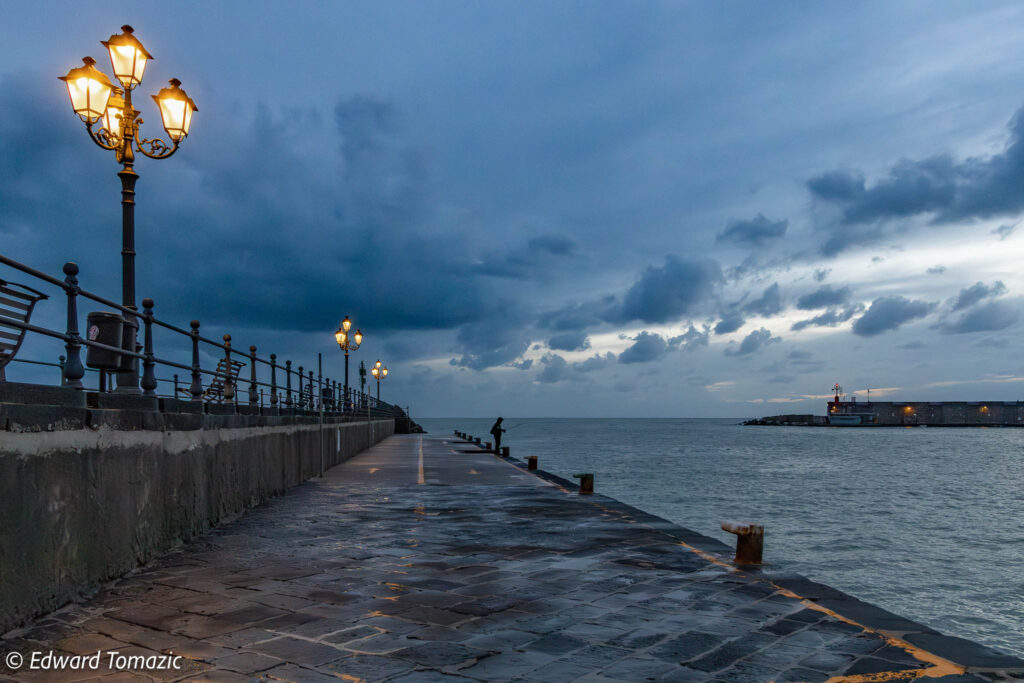 The quiet beauty of Amalfi comes alive in this moody seascape β lanterns glowing against deepening twilight, a lone fisherman casting into the calm waters, and storm clouds drifting across the horizon. This evocative image blends romance, solitude, and timeless coastal charm, transporting you to the heart of Italyβs celebrated shoreline.